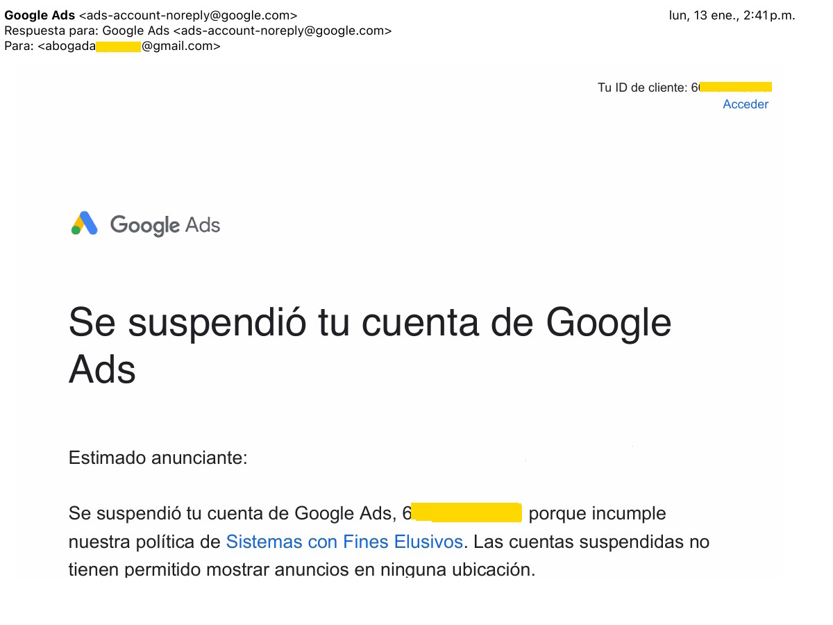 Una profesional del sector legal recibió la suspensión total de su cuenta de Google Ads por incumplimiento de la política de “Sistemas con Fines Elusivos”.