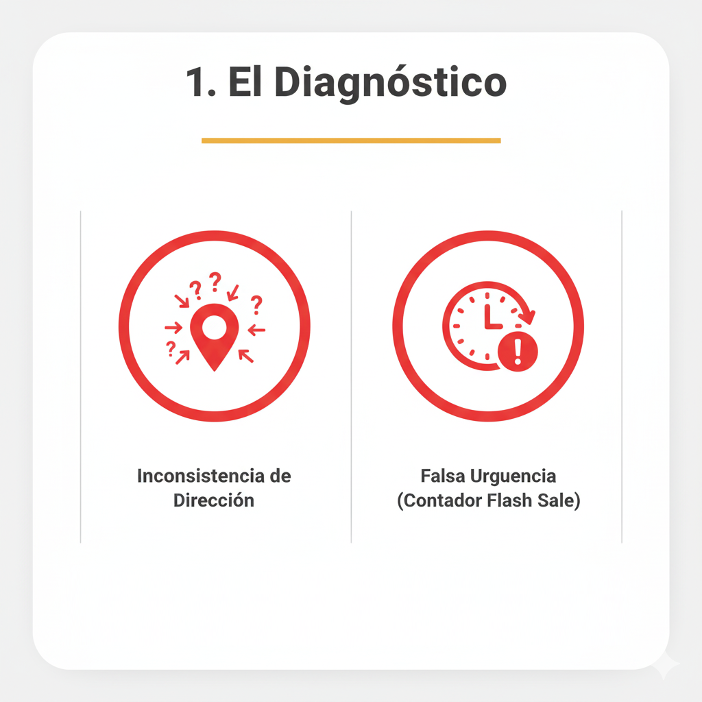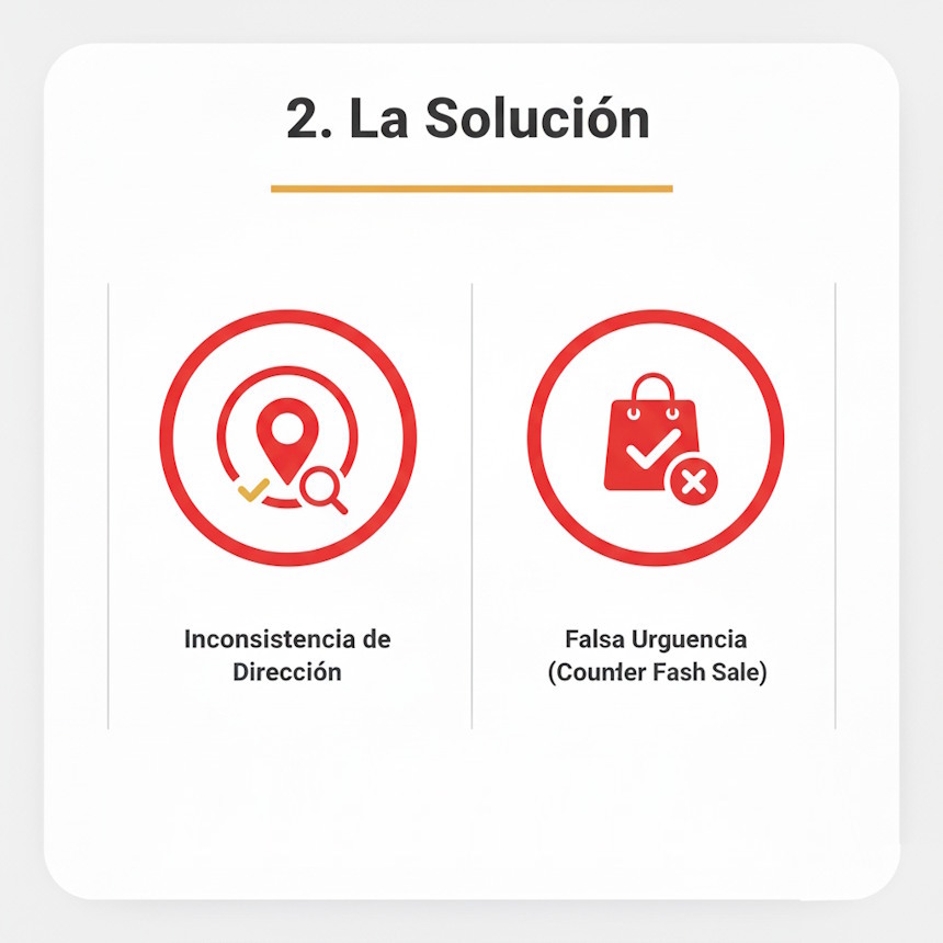 La auditoría reveló un patrón de riesgo claro: el sitio web mostraba múltiples direcciones comerciales que no coincidían con la de Merchant Center y utilizaba un contador ‘Flash Sale’ persistente para crear un ‘falso sentido de urgencia’, una violación directa de las políticas.
